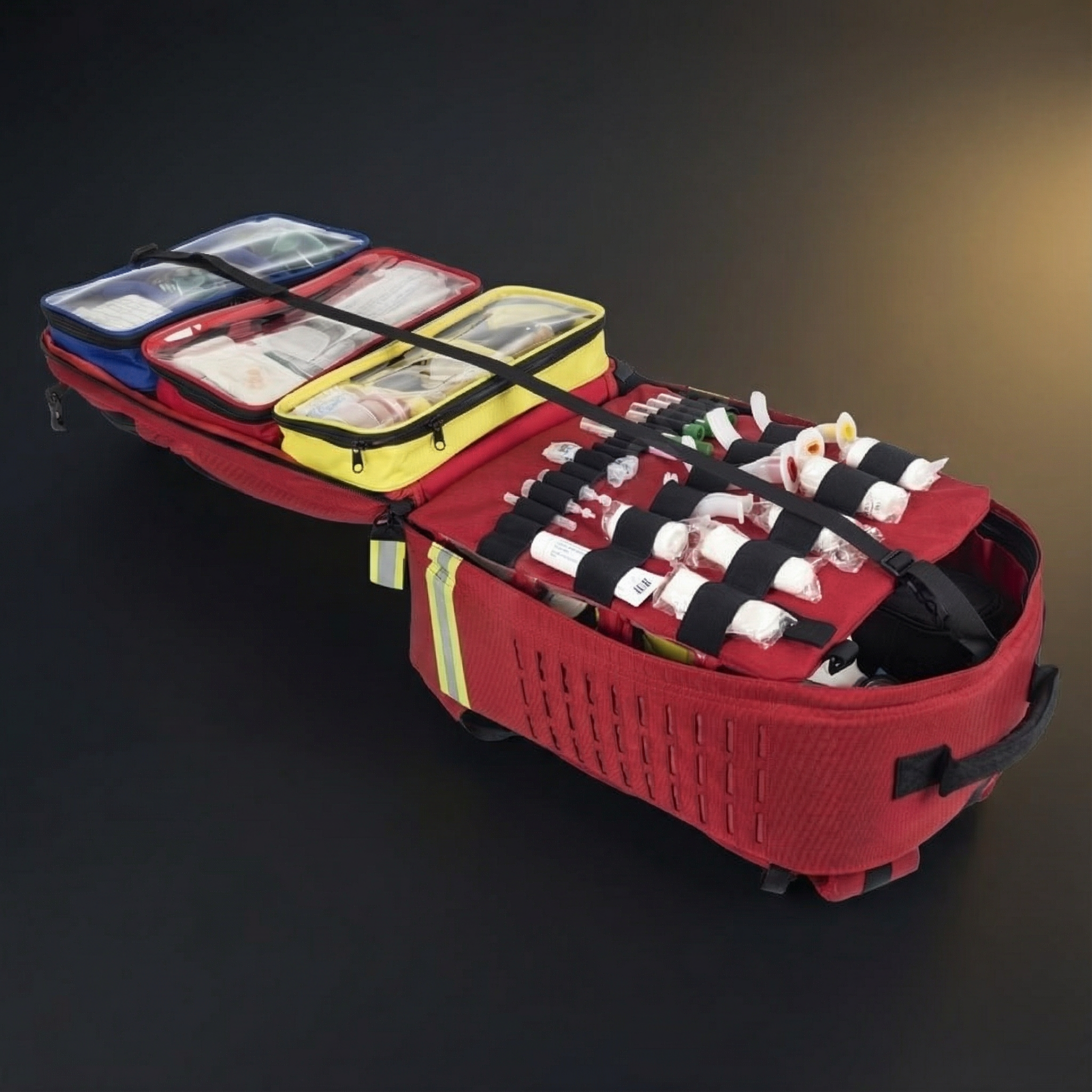 The segmented interior carries airway, bleeding control, diagnostic, and medication supplies in a disciplined, mission-ready layout. Clear-lid modules let you confirm inventory at a glance—no more guessing what's packed where.
